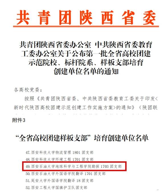 近日,经校团委推荐,共青团陕西省委办公室、中共陕西省委教育工委办公室联合公布了“第一批全省高校示范院校、标杆院系、样板支部培育创建单位名单”。伟德国际1946源于英国勘探1703团支部获批“陕西省高校团建样板团支部”培育创建单位。