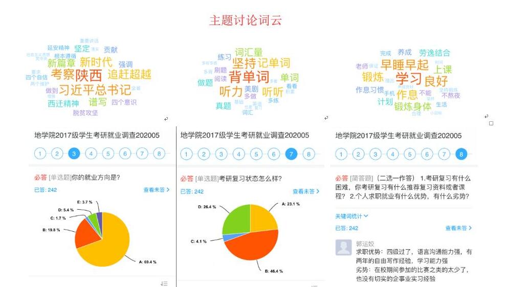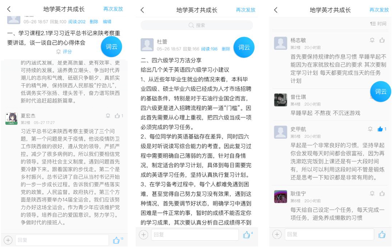 公司学工办在超星学习通平台建立“地学英才共成长”课程门户。首先,各年级员工共同学习了习近平总书记来陕考察重要讲话,并在主题讨论模块发表学习心得。随后,学工办老师针对不同年级发布主题讨论话题。2019级员工专题讨论:“居家网课期间,少了老师的引导和同学的陪伴,你是怎样进行自我管理的,关于学习习惯的养成你又有什么好的方法?”2018级员工专题学习辅导员老师撰写的英语四六级学习经验分享网文,并跟帖分享自己英语学习的好方法。2017级员工填写就业考研意向的调查问卷。各年级员工在APP内跟帖发言,互动效果良好。