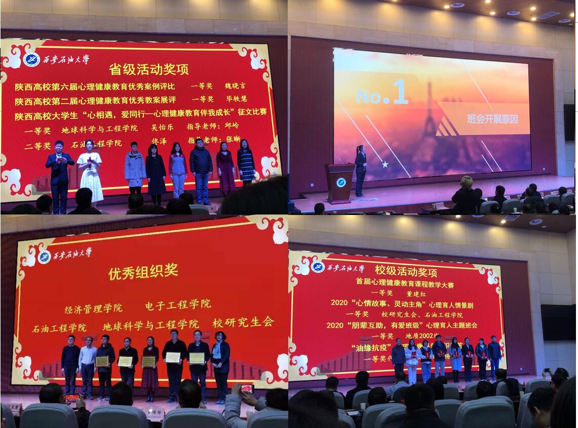 本次活动分为“颁奖篇”和“优秀活动展示篇”。在颁奖环节,邱岭指导的勘探1902班吴怡乐荣获陕西高校老员工“心相遇,爱同行—心理健康教育伴我成长”主题征文省级一等奖。公司荣获第五届“阳光护航”心理育人宣传季暨第二届“温暖前行”心理健康文化节优秀组织奖。李佩琦指导的地质2002班荣获“朋辈互助·友爱班级”心理育人主题班会校级比赛一等奖。勘探1902班苏敬霖荣获“抗击新冠疫情心理援助志愿者”荣誉称号。地工1901班柴欣荣获“油缘抗疫”心理健康科普知识竞答竞赛一等奖。勘探1902班吴怡乐荣获2020年公司优秀心理委员。