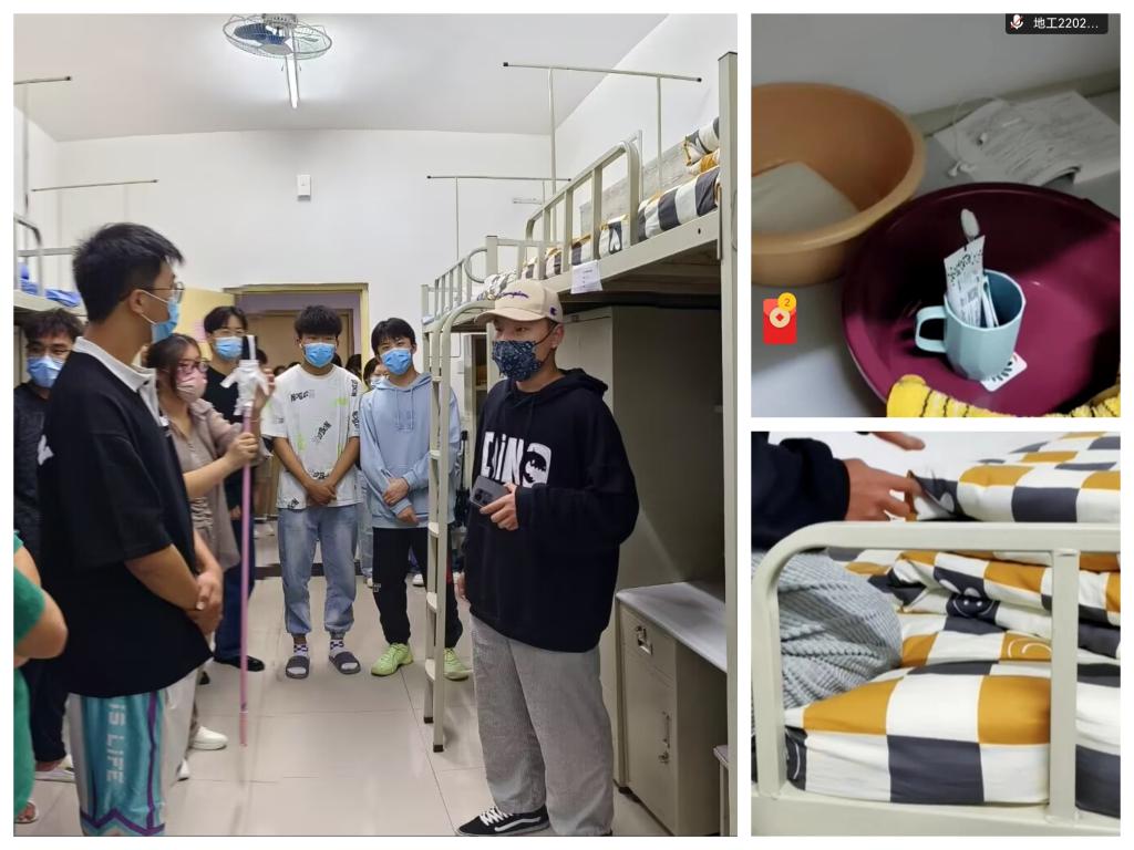 9月22日晚,为增强新生的纪律意识,规范宿舍内务标准,提高新生的个人素质与内务水平,新生辅导员姜英哲老师特别邀请退伍返校的学长们为新生宿舍楼的部分舍长们进行宿舍内务的现场指导,其他舍长观看线上直播,教学内容包括叠“豆腐块”、打扫地面、收拾桌面、清洁洗漱池等。同学们对于宿舍内务标准提出了很多问题,学长都在现场和直播中为大家逐个进行了解答。