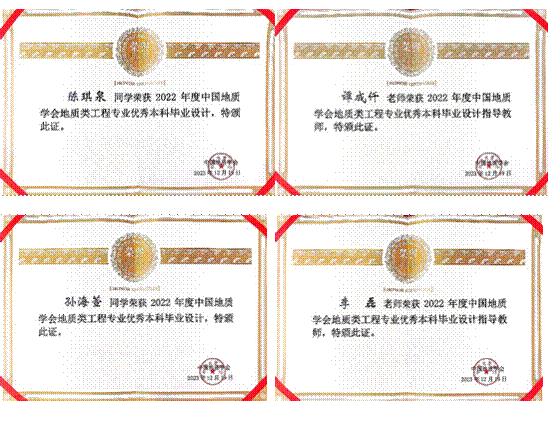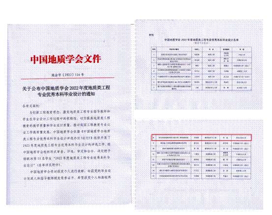 “地质类工程专业优秀本科毕业设计评选”中国地质学会设置,由地质类工程专业认证通过高校相关专业师生申请,旨在为创新工程教育理念,激发地质类工程专业指导教师和员工在毕业设计工作过程中的积极性,切实提高地质类工程教育的教学质量和毕业设计质量,推动我国工程教育专业认证工作高质量发展。中国地质学会通过对全国地质类工程专业认证通过的相关专业申请材料的形式审查、评选、审定和公示,最终决定授予15篇优秀毕业设计(论文)和18名优秀指导教师。公司勘查技术与工程专业申报的两篇毕业设计(论文)均获奖,说明公司本科毕业设计(论文)的质量在稳步提高,专业建设取得了明显的成效。
