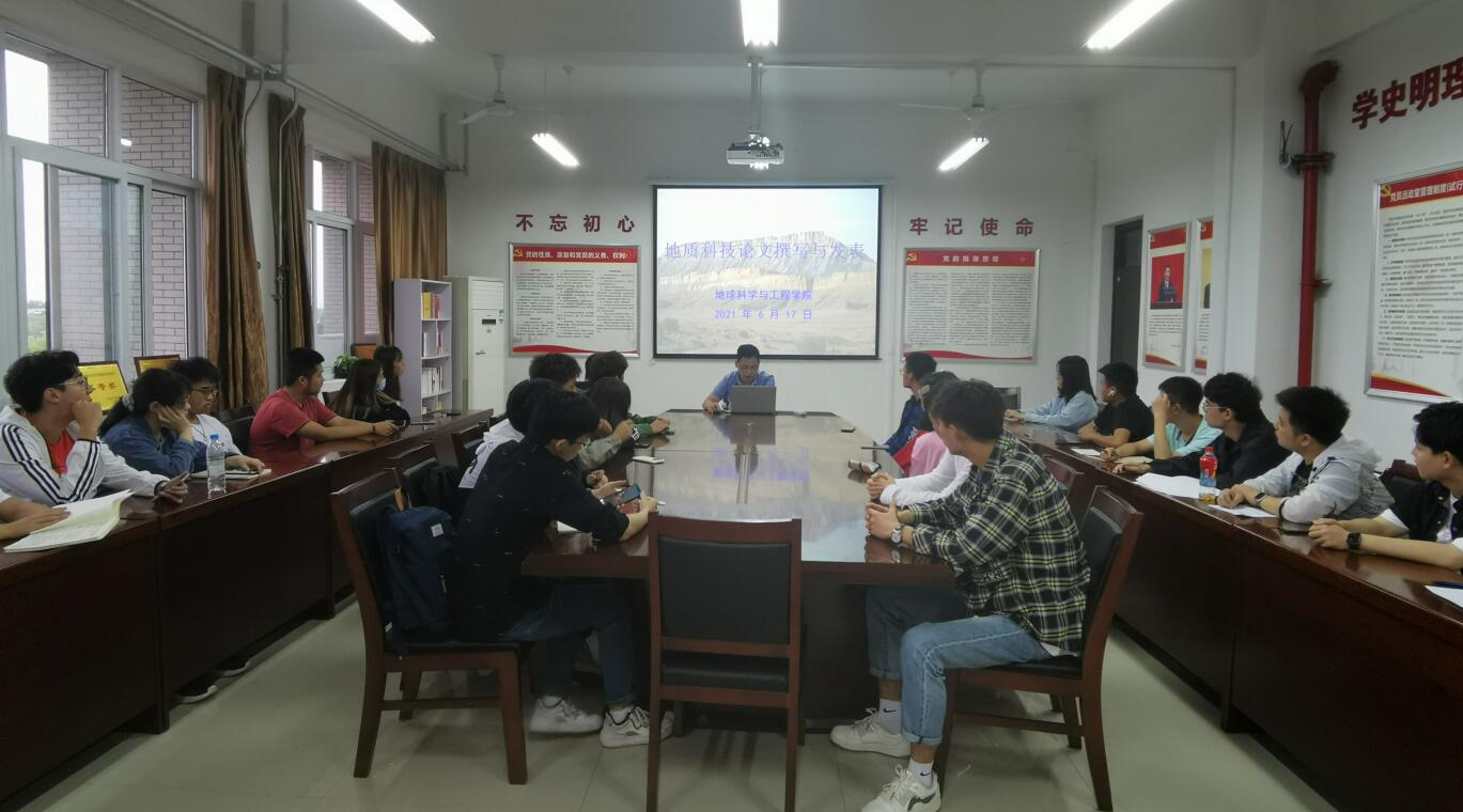 赵驰学长主要从地质科技论文分类、地质科技论文撰写格式、文献搜索以及投稿流程共四部分向同学们系统介绍了地质类论文该如何定题、撰写、投稿、发表等知识。他通过三个实例向同学们讲解了各类专业以何种方向定题,详细介绍了文献搜索方法和推荐投稿的期刊。同学们认真记录、交流讨论,收获颇丰。
